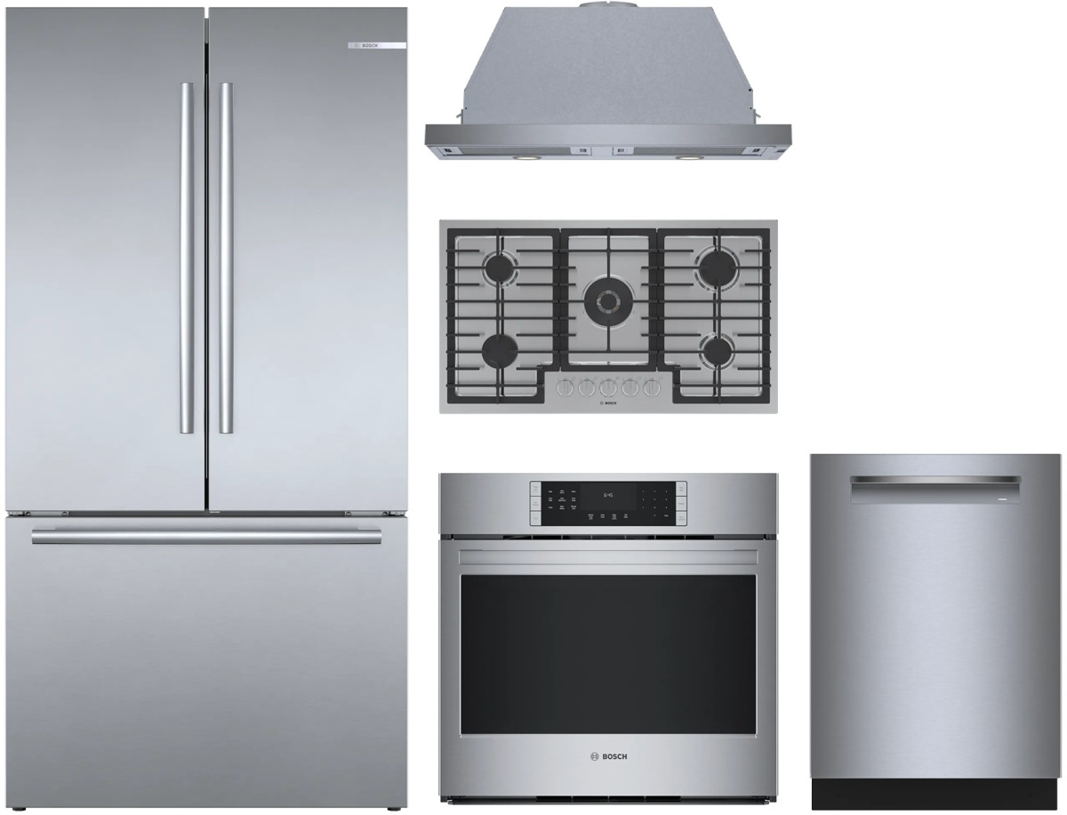 Bosch 5 Piece Stainless Steel Kitchen Package with French door refrigerator, built in dishwasher, single electric wall oven, gas cooktop and under cabinet range hood.Read More